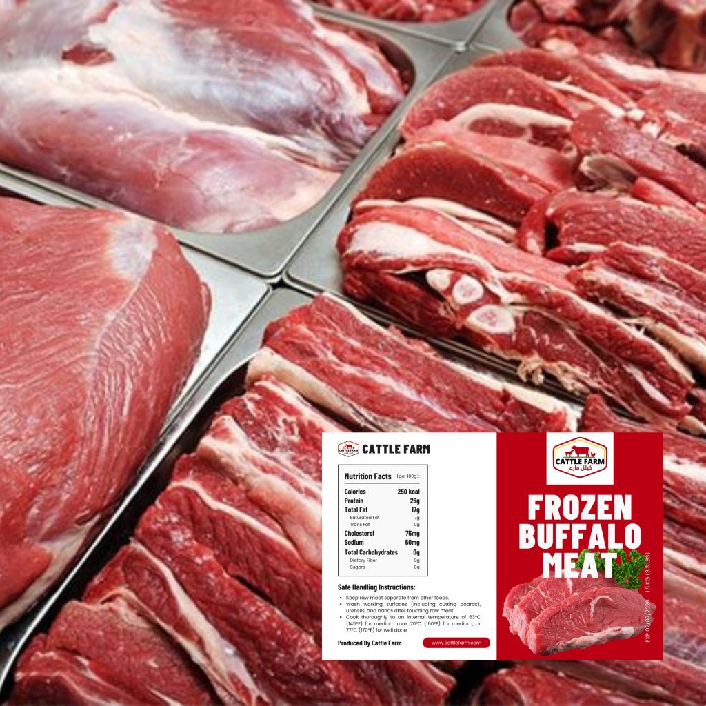 Cattle Farm’s frozen boneless buffalo meat is carefully trimmed, tender, and packed to preserve freshness and natural flavor. Ideal for bulk buyers, restaurants, and international distributors, it delivers consistent quality for steaks, roasts, and processed meat applications.